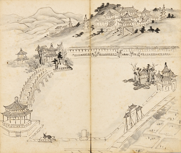 를 거치면서 많은 사찰과 별장이 세워졌으며, 청대에 들어와 창춘원(暢春園)과 원명원(圓明園), 그리고 강희제가 옥천산에 조성한 정명원(靜明園), 건륭제가 향산에 조성한 정의원(靜宜園) 및 만수산에 조성한 청의원(淸漪園, 지금의 이화원(頤和園))까지 다섯 행궁이 서산 일대에 위치하면서 서산은 특정한 산 하나를 지칭하기보다는 황실의 원유지로 여겨졌다. 서산은 경관이 수려할 뿐 아니라 명승고적이 즐비해 북경을 대표하는 명산으로 인식되었다. 연경팔경의 하나인 ‘서산청설(西山晴雪, 서산의 갠 눈)’은 바로 서산에 눈이 내린 겨울 풍경을 빼어난 경관으로 여겨 선정한 것이다. 조선후기 연행록에서 서산을 관광한 날은 대체로 ‘서산(西山)’ 또는 ‘해전(海甸, 해정(海淀))’에 갔다는 표현을 사용했으며, 간혹 ‘서호’나 ‘곤명호’라 지칭하기도 했다. 유람한 범위를 살펴보면 곤명호 주변과 그에 인접한 원명원 서쪽 구역 일부이다. 범위를 더 좁히면 곤명호의 동쪽 연안에 있는 십칠공교(十七孔橋)와 수의교(繡漪橋) 인근에서 벗어나지 않는다. 즉 현재 이화원의 동제(東堤)와 남호도(南湖島) 구역에 국한된다. 【그림 16】 강세황 필 《사로삼기첩(槎路三奇帖)》 중 〈서산누각(西山樓閣)〉(국립중앙박물관 소장)18-19세기 조선 사절단이 관광한 ‘서산’의 범위를 잘 보여 준다. 1784년 동지 부사 강세황(姜世晃)은 정사 이휘지(李徽之)와 함께 원명원 연회에 갔다가 서산을 유람하고 그림과 시를 남겼다. 강세황의 그림을 보면, 멀리 만수산에 청의원이 세워져 있고 산 남쪽 아래에 장랑(長廊)이 가로놓여 있으며, 곤명호 동쪽 편에 문창각(文昌閣)이 있고 아래로 패루를 지나 동우(銅牛)와 확여정(廓如亭), 그리고 십칠공교로 이어진 남호도(南湖島)까지 조선 사절단이 일반적으로 견문한 서산의 전경을 간결하게 묘사했다. 조선 사절단이 목도한 서산의 규모가 갖추어진 것은 1760년을 전후한 시점이다. 1760년 진하부사 서명신은 정사 해운군(海運君) 연(槤)과 함께 서산에 가기로 약속한 후, 이튿날 ‘만수산(萬壽山)의 이궁(離宮, 별궁)’, 즉 청의원에 당도하여 곤명호와 십칠공교, 수의교(繡漪橋) 등을 구경했다. 들으니 건륭이 남쪽으로 순행하여 서호(西湖)를 본 뒤에 다시 가서 노닐고자 하였으나 태후가 그를 만류하며 “어찌 서호를 모방하여 가까운 곳에 만들어 놓지 않고 기필코 멀리 순행하려 하는가?”라고 했다고 한다. 그러므로 황제가 한결같이 서호를 본떠서 이곳에 만들고 그 물을 끌어와서 황성(皇城, 자금성) 안에 물을 대었다. 성 안에서부터 배를 타고 서호를 왕래하기 때문에, 동서로 거슬러 올라가면서 서호와 같이 누대를 설치한 것이다. 서명신은 건륭제가 황태후의 권유로 절강성 항주(杭州)의 서호(西湖)를 모방하여 옹산(甕山) 자락에 인공호수인 곤명호를 조성한 사실을 언급했다. 건륭제는 1751년 황태후의 60세 생신을 축하하고 축수를 빌기 위해 옹산에 연수사(延壽寺)라는 절을 세우고 옹산을 ‘만수산(萬壽山)’으로 고쳤다. 아울러 곤명호 중앙에 남호도라는 인공섬을 만들고 십칠공교라는 긴 돌다리를 놓았으며, 곤명호 확장공사를 마친 1755년에는 호숫가에 청동으로 만든 동우를 두어 치수를 기원했다. 따라서 서명신이 서산에 갔을 때는 조선 후기 문인들이 ‘서산’으로 인식했던 그 권역, 즉 만수산에 청의원이 들어서고 곤명호 주위에 정자와 다리가 완성된 직후였던 것이다. 【그림 17】 십칠공교17개의 아치가 있다고 하여 붙여진 이름이다. 【그림 18】 동우청동으로 만든 소의 등에 건륭제가 쓴 명(銘)이 전서로 씌어 있다. 서산은 1781년 동지 사행단이 정월 보름에 열린 원명원 상원연(上元宴)에 참석하면서 공식 일정에 수반된 관광 코스가 되었다. 원명원 안에서도 연회 장소인 산고수장각과 정대광명전이 곤명호와 가장 근접해 있었기에, 조선 사신들은 주로 연회를 마치고 관소로 돌아갈 때 서산 권역을 경유했다. 또 원명원에서의 의례와 무관한 날에 사적인 유람을 나서기도 했다. 권복인은 글의 도입부에서 “외국에서 태어나 연경을 보지 않았으면 그 거대함을 다 알 수 없고, 연경을 유람하면서 서산을 보지 않았으면 그 아름다움을 다 알 수 없다고 하였으니, 이 말을 믿을 수 있겠구나!”라며 북경에서 서산이 가장 아름다운 곳임을 암시하였다. 특히 십칠공교를 건너면서부터 남호도 내의 동정유상(洞庭留賞) 누각에 올라 만수산을 바라본 감흥을 집중적으로 표출한 뒤, 옥천산과 향산으로 시선을 확장하여 곤명호를 둘러싸고 있는 산의 형세를 전체적으로 묘사하며 서산 내에서 으뜸이라 평했다. 【그림 19】 곤명호와 만수산의 모습 서산은 유람의 공간이면서 청조의 실상을 탐문하는 공간이기도 하였다. 건륭제가 막대한 인력과 재정을 들여 조성한 청의원과 곤명호는 조선 문인들에게 경탄의 대상임과 동시에 비판의 대상이 되었다. 대체로 창춘원과 원명원을 대비하여 강희제와 건륭제에 대해 상반된 평가를 내렸다. 김창업이 강희제의 검소함을 강조한 이래로 이의봉, 홍대용, 박지원 등이 공통적으로 창춘원의 규모가 소박한 것을 들어 강희제의 60년간 태