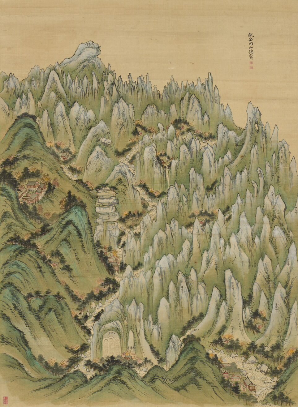 후기에는 금강산 사찰에 예불하는 사람들이 계층을 막론하고 줄을 이어 암자가 일 년에 백 개씩 불어날 정도였다고 한다. 금강산은 고려시대를 거치면서 불교 성지로 명성을 얻었을 뿐만 아니라 경치 자체도 국내에서 가장 수려한 지역이었다. 우리나라에서는 예로부터 삼신산(三神山)으로 불리던 금강‧지리‧한라산이 대표적 명승으로 꼽혔다. 삼신산은 『열자(列子)』 「탕문(湯問)」편에 나오는 봉래(蓬萊)‧방장(方丈)‧영주(瀛洲)다. 발해(渤海)에 섬으로 존재해 있으면서 신선이 살고 있다 전한다. 원래 이 삼신산과 더불어 대여(岱輿)‧원교(圓嶠) 다섯 산이 있었는데, 조수에 밀려 표류하자 천제(天帝)가 각각 3마리씩 모두 15마리의 자라로 하여 이 산들을 떠받치고 있게 하였다고 한다. 뒤에 용백국(龍伯國)의 거인이 자라 6마리를 낚아 올려 등에 지고 자기 나라로 돌아갔으므로 대여와 원교 두 산은 서쪽 끝으로(서극(西極)) 떠내려가고, 심신산만 남게 되었다고 한다. 사람들은 삼신산에 신선이 살고 있으며, 불로초가 있다고 믿었다. 그러므로 진시황(秦始皇)이나 한무제(漢武帝)가 방술사(方術士)의 말을 듣고, 불사약을 구하기 위해 직접 동해까지 갔다가 돌아왔다는 일화가 있을 정도다. 우리나라도 중국의 삼신산을 본떠 금강산을 봉래산, 지리산을 방장산, 한라산을 영주산으로 일컬었다. 남계(南溪) 신명구(申命耉, 1666-1742) 같은 선비는 삼신산이 우리나라에 있다고 굳게 믿었다. 【그림 5】 《천하도》의 삼신산 부분, 조선후기, 국립중앙도서관 삼신산은 일찍부터 신선이 살고 있다는 명산으로 알려져 있었다. ‘알려져 있었다’라는 것은 당시 사람들이 그것을 ‘굳게 믿었다’는 것보다는 산신이 실제로 그곳에 있길 바랐던, 간절한 소망을 나타내는 것일 테다. 조선시대에 만들어지는 각종 「천하도(天下圖)」에 삼신산이 빠지지 않고 표시되어 있을 만큼 동방의 신선 세계로 유명하였다. 조선의 삼신산으로 불리는 금강‧지리‧한라산은 많은 이들이 유람을 소망했다. 청성(靑城) 성대중(成大中, 1732-1809)은 금강산은 기이하고 변화무쌍한 것이 석가와 같고, 지리산은 넓고 크며 활달한 것이 공자와 같고, 한라산은 높고 험하며 홀로 솟은 것이 노중련(魯仲連)과 같다며, 삼신산을 성현에 비유했다. 삼신산 중 금강산의 명성은 좀처럼 수그러들지 않았다. 조선시대에 오면 금강산 유람 열기는 더욱 고조되고, 전시기에 걸쳐 유람객의 발길이 끊이지 않았다. 당시 금강산 유람객에 대한 통계가 없어 알 수 없지만, 17-18세기 문인화가 조영석(趙榮祏, 1686-1761)의 『관아재고(觀我齋稿)』에는 한 해 동안 금강산을 찾는 유람객이 어림잡아 수천 명이 넘었다고 기록되어 있다. 금강산은 산 자체가 지닌 수려한 경치만으로도 사람들에게 동경의 대상이 되어왔고, 많은 사람이 유람을 소망했다. 사람들 사이에서 금강산을 유람하는 것은 신선의 명단(선적(仙籍))에 이름을 올리는 것이라 할 정도였다. 백두산은 최북단 국경에 있고, 한라산은 바다를 건너야 하는 지리적 여건으로 유람이 어려웠다. 삼신산이 우리나라에 있다고 믿었던 신명구는, 삼신산 중 한라산은 탐라의 벼슬을 하는 자가 아니고서 바다 건너 그곳을 유람했다는 사람을 세상에서 본 적이 없다고 했다. 그만큼 한라산은 명성에 반해 유람이 어려웠다. 조선시대 가장 많은 사람이 유람한 곳은 금강산이었고, 창작된 산수유기도 금강산이 다른 산에 비해 월등히 많다. 금강산은 불교 성지로 명성을 얻었지만, 유가적 성향을 지닌 선비들도 금강산을 꾸준히 유람하였다. 이들은 한편으로는 금강산에 산재한 불교 의식을 폄하하기도 했으나, 다른 한편으로는 조선의 오랜 역사와 문화가 축적된 보고로 생각하고 생애에 꼭 한 번 돌아보아야 할 곳으로 인식했다. 금강산 유람을 평생의 소원으로 간직한 사람들도 많았다. 고려말의 문신 가정(稼亭) 이곡(李穀, 1298-1351)은 회양의 천마령(天磨嶺)에 올라 금강산을 한 번 바라보는 것으로 평생의 소원을 다 풀었다고 감탄할 정도였다. 하늘 찌르는 흰 눈빛 신광을 발하나니 / 攙天雪色放神光 천자가 해마다 이 때문에 향을 내리시네 / 天子年年爲降香 한번 보고서 평생의 소원 이미 다 풀었으니 / 一望平生心已了 깊이 파묻혀 노끈 의자에 앉아 있을 필요 있는가 / 不須深處坐繩床 『가정집(稼亭集)』 권19, 율시(律詩), 「천마령 위에서 금강산을 바라보며(天磨嶺上望金剛山)」 【그림 6】 정수영, 《해산첩》 중 〈금강전도〉, 1799년, 국립중앙박물관 김창협은 금강산의 산수 경관이 동방에서 가장 뛰어나다고 평가했다. 그리고 금강산을 두 번이나 유람하였지만 언젠간 다시 가 보고 싶은 심정을 토로하였다. 김창협과 같이 당시 선비들이 금강산 유람 욕구를 억제하지 못하고 꼭 가서 보고자 했던 이유는 금강산 경치가 기이하여 누구에게 얘기하기도 어렵고, 설사 듣는다고 하더라도 이해하기가 어렵기 때문이었다. 금강산은 직접 보고도 그 형상을 얘기하기 어려우므로, 금강산을 제대로 알고자 하면 직접 가서 유람해야 한다는 것이다. 간이(簡易) 최립(崔岦, 1539-1612)은 금강산 경치라고 하는 것이 아버지가 다